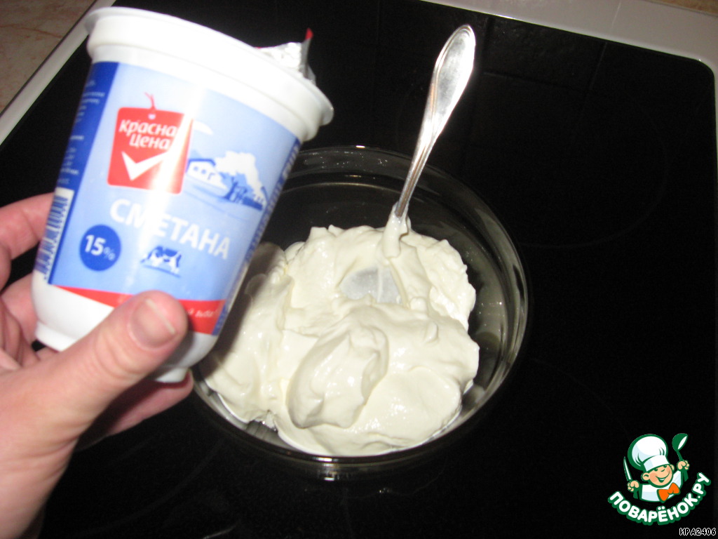 КРЕМ: сметану смешиваем с сахаром.