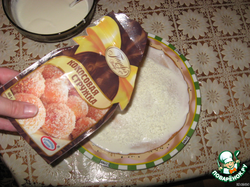 Сверху посыпаем кокосовой стружкой и декоративной посыпкой. Дать пропитаться в холодильнике. Приятного аппетита!