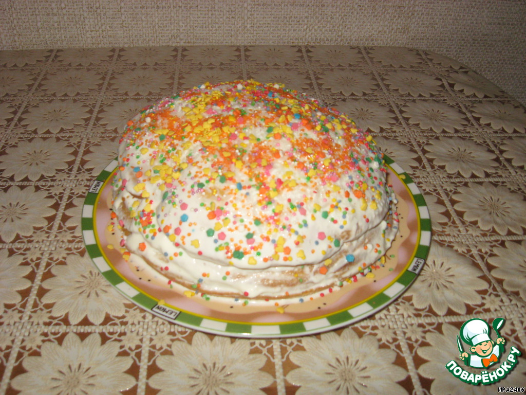 Сверху готовый торт посыпаем кокосовой стружкой и декоративной посыпкой.Ставим в холодильник для проптики на 2 часа.