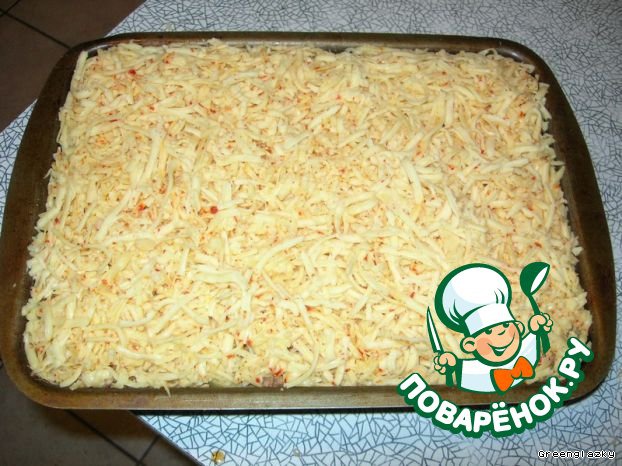 На этом этапе у меня кончились продукты и я почти достиг края противня – это значит что пора засыпать сыром. Сыра сыпем много. Очень много. Так, чтобы не видеть ничего под сыром.