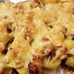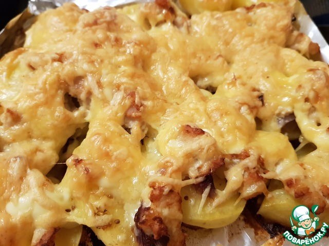 Давайте это блюдо назовем его именем, Картофель плавающий в луке, залитый сыром, с запахом фарша.(НЕТ, запах лука убьет запах фарша