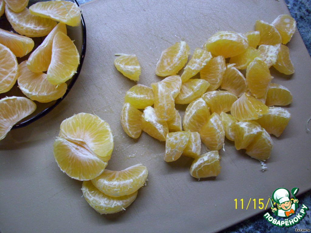 Мандарины очищаем, разбираем на дольки. Несколько долек откладываем на украшение, остальные разрезаем острым ножом на половинки.