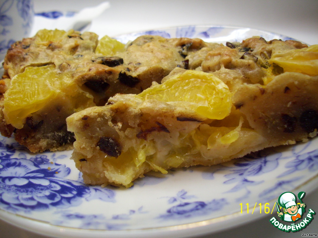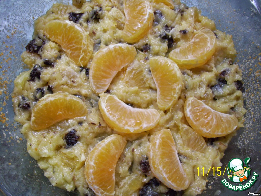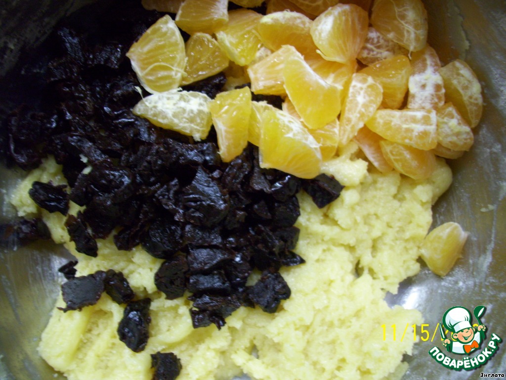 И добавляем в тесто вместе с черносливом. Перемешиваем. Должна отметить, что этот процесс вызвал у меня некоторые затруднения, т.к. тесто получается довольно густым. После недолгих раздумий отложила все инструменты и перемешала массу руками, стараясь, как можно меньше мять мандарины.