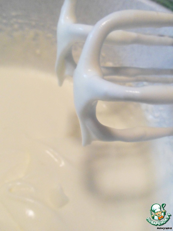 Сливки хорошо взбить и аккуратно вмешать в мусс, далее белки взбиваем со 100 г сахара до твердых пиков, также очень аккуратно вмешать в мусс.