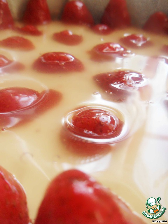 Поливаем получившимся желе клубнику, постепенно, сначала несколько ложек, чтобы приклеить клубнику, и отправляем в холодильник на 15 минут, потом достаем и поливаем оставшимся желе (уже позже я подумала, что можно заменить обычный желатин на желе для торта быстрого застывания).