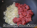 Разогреть масло, обжарить нашинкованный лук, добавить кусочки нарезанного кубиками мяса, обжаривать 10-15 минут.