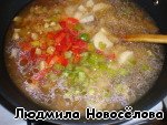 Незадолго до готовности мяса добавить ещё воды, нарезанные овощи, посолить и довести до готовности на среднем огне.