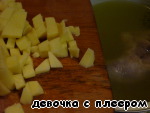 Картофель нарезать кубиками и добавить в кипящий бульон, варить до полуготовности. -