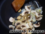 Лук нарезать мелкими кубиками, шампиньоны ломтиками. Обжарить на растительном масле и добавить в суп.