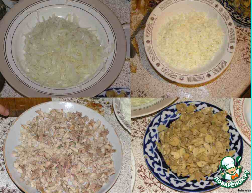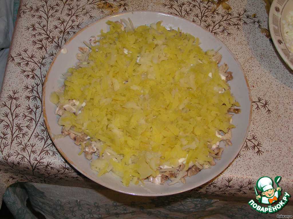 Курицу, грибы, лук мелко нарезать. Белки, сыр и картофель натереть на крупной или средней терке - по желанию. Я делала яйца на средней, а сыр и картошку - на крупной.