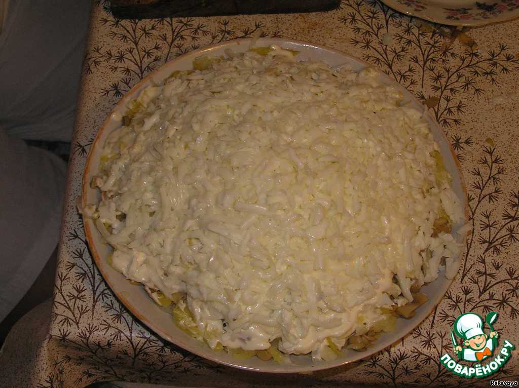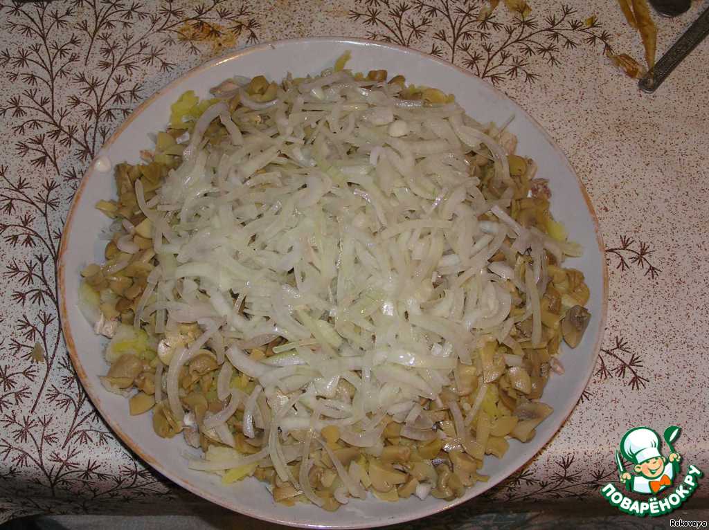 На грибы выкладываем оставшийся лук.