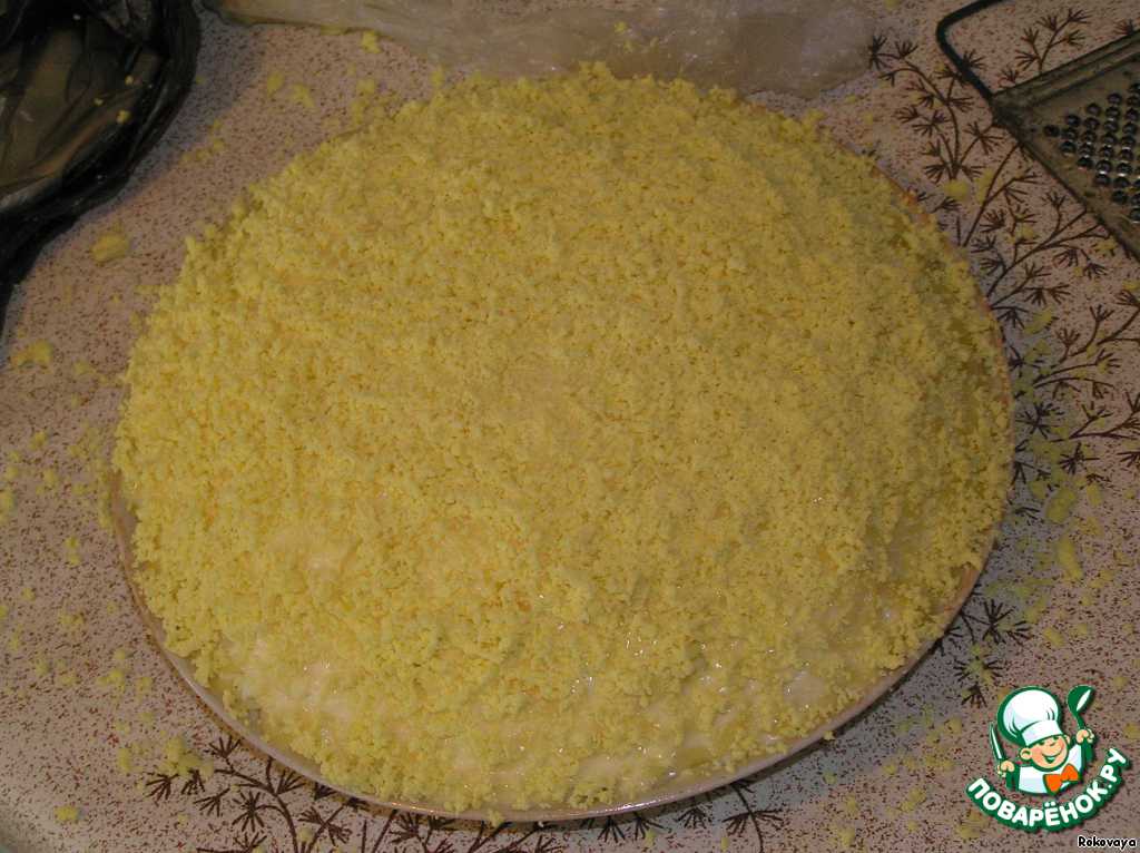 Желтки натераем на мелкой терке прямо над салатом, равномерно осыпая его со всех сторон. На этом этапе Вам понадобиться помощник, который будет вертеть салат в разные стороны и нагибать его чтобы получилось красиво, главное не переворачивать вверх ногами :)