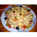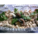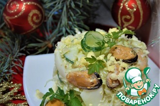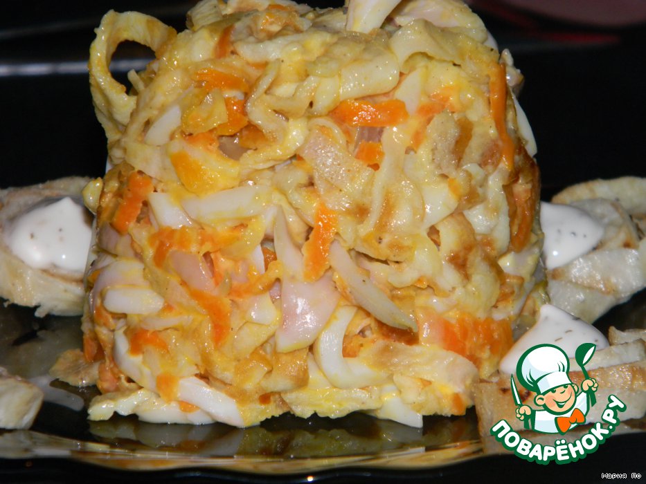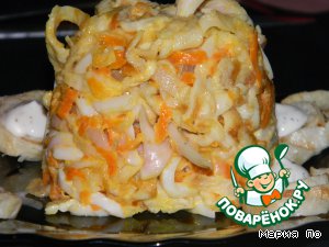 Подобным способом в нашей семье готовят салат "Министерск ий"! Предлагаю попробовать измененный вариант. Салат получается очень сытный. Рецепт этого блюда был размещен на сайте в 2009 году мной под названием "Салат кальмарчик" и иллюстрирован мной в рамках акции "Раскраски".