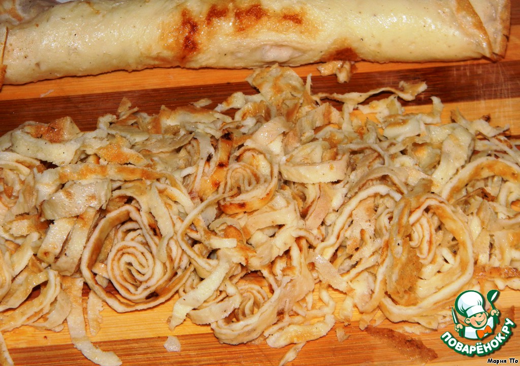 Взбиваем яйца с молоком, немного солим и перчим. На разогретой сковороде с маслом жарим тонкие блинчики.