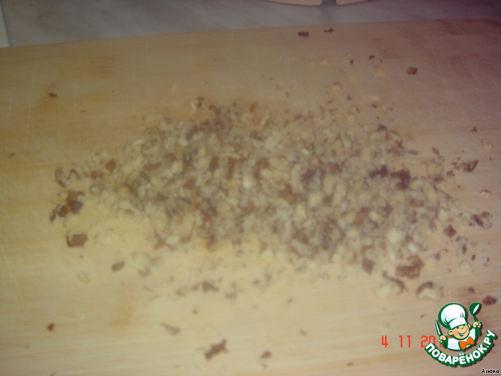 Мелко перемолоть орехи. Я просто проехалась скалкой.
