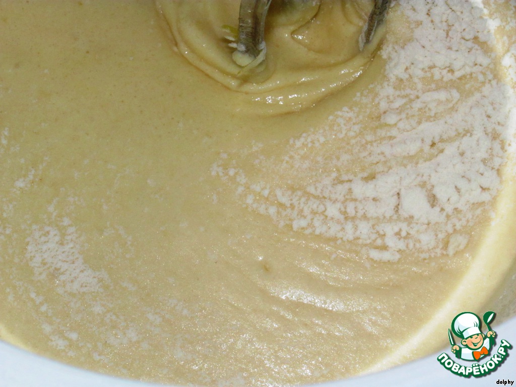 Снова уменьшите скорость и добавьте муку с разрыхлителем.