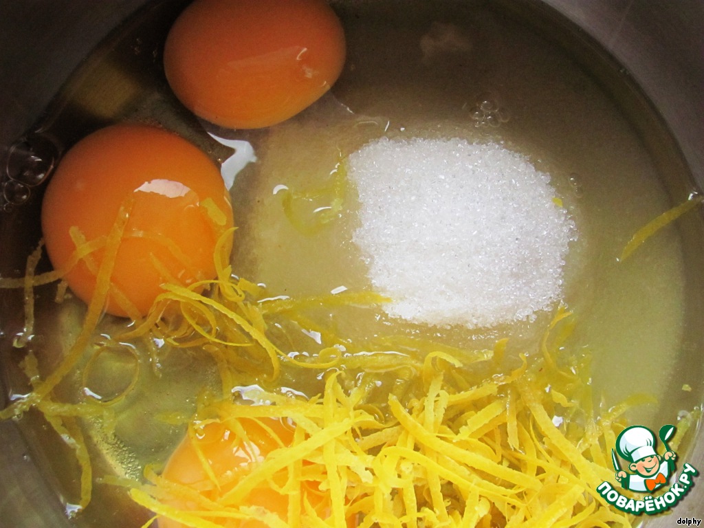 В кастрюле взбейте 3 яйца, цедру одного лимона и 100 г сахара.