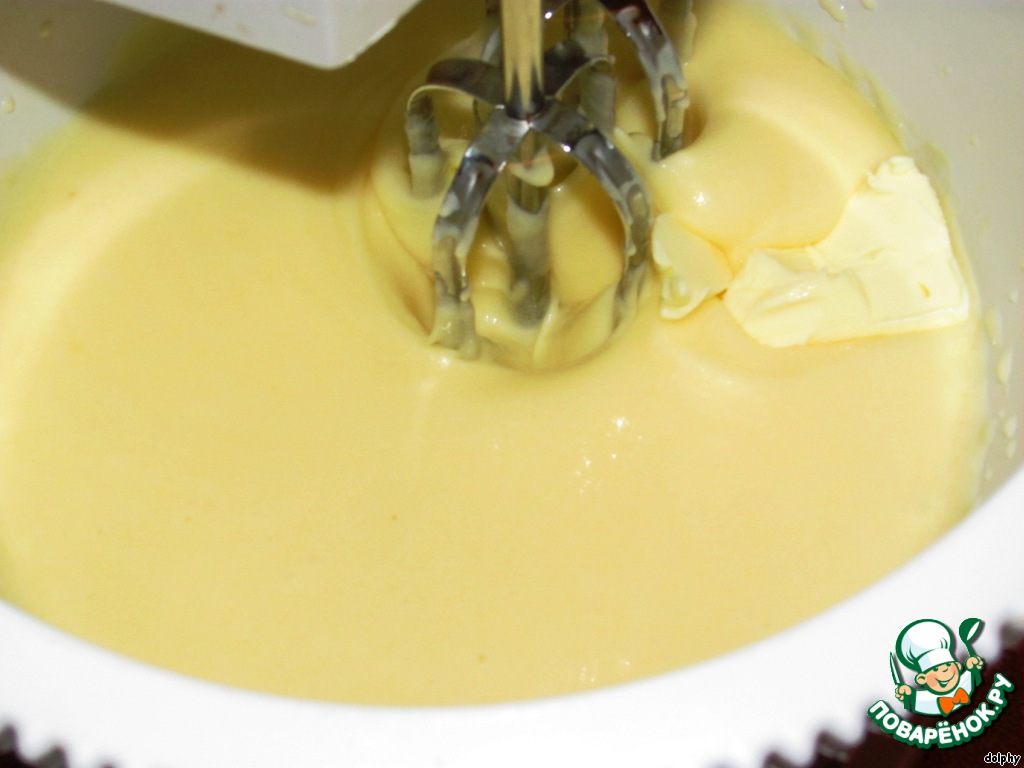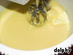 Начните взбивать миксером, постепенно добавляя небольшие кусочки масла (150 г).