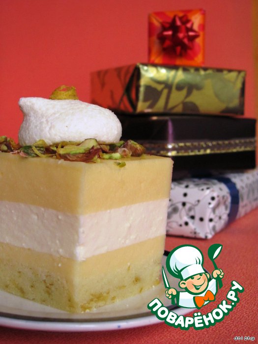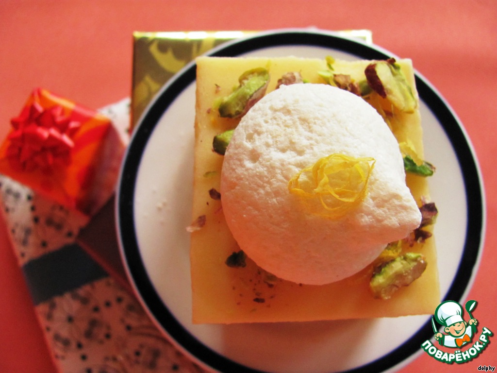 Разрежьте на пирожные. Украсьте меренгами, рубленными фисташками и цедрой лимона.
