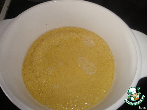 • 300 мл воды довести до кипения, посолить и залить кус-кус. Дать 5-10 мин. набухнуть.