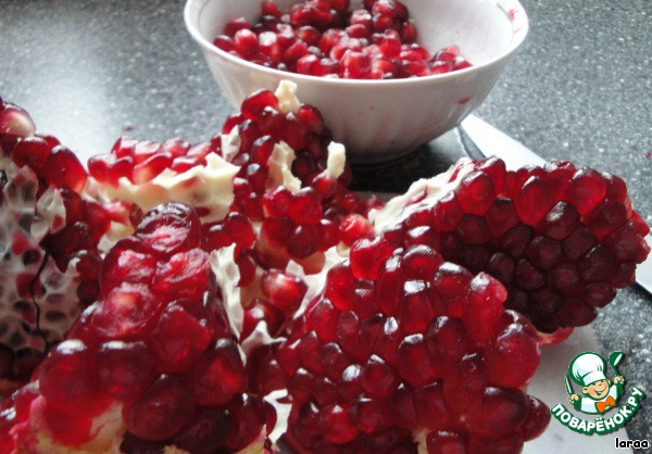 • Гранат очистить. Кедровые орешки обжарить на сухой сковороде. Мятные листочки меленько порезать.