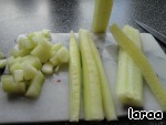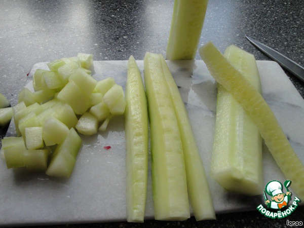 • Огурец очистить, разрезать на 4 части. Удалить семена и затем нарезать на мелкие кусочки.