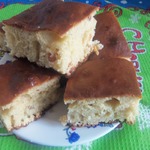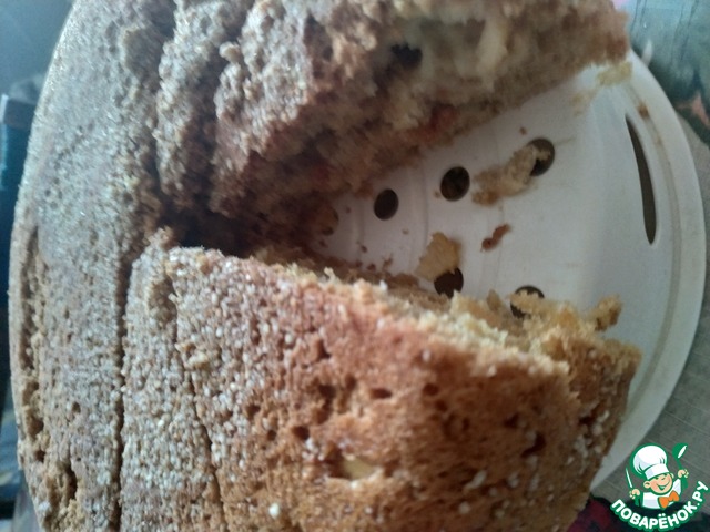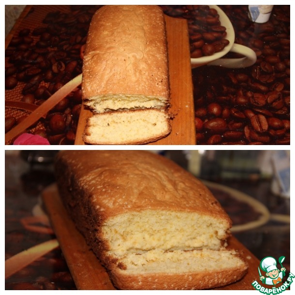 А здесь я выпекала в прямоугольной форме. Выпекать нужно уже подольше. Готовность нужно проверить спичкой: если она выходит из пирога сухая, то пирог готов.