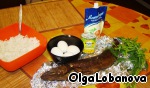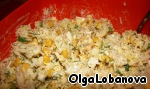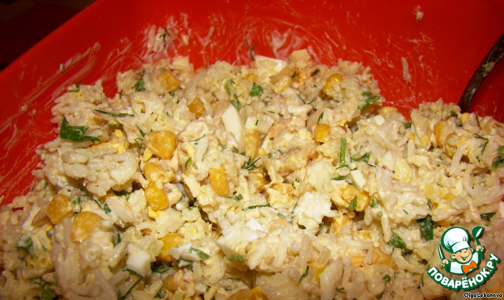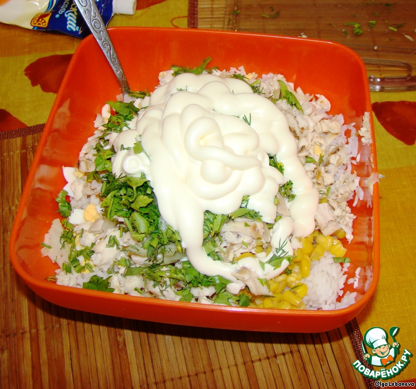 Все ингредиенты, в том числе и рис, смешиваем с майонезом.