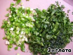 рубленую зелень, соль и специи по вкусу. Перемешать