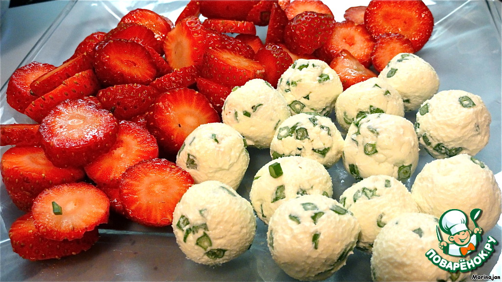 Рецепт этого блюда был размещeн на сайте в 2008 году пользователем Kris_Satin и иллюстрирован мной в рамках акции "Раскраски". Оригинальный вкусный салатик с сырными шариками, клубникой и кедровыми орешками... и очень простой в приготовлении.