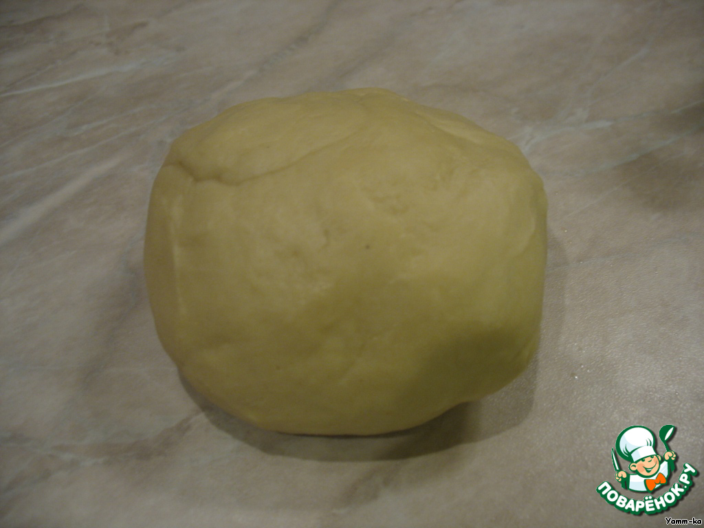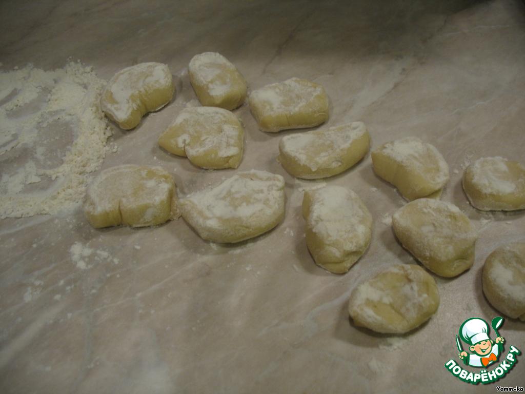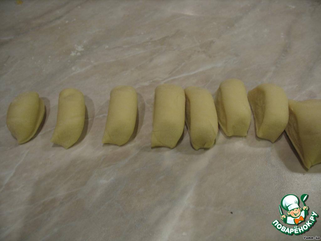 Теперь достаем тесто, катаем из него колбаску и режем на части.