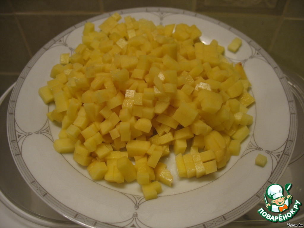 Нарезаем кубиками картофель, смешиваем с салом, луком и мясом. Солим, перчим. Начинка готова.