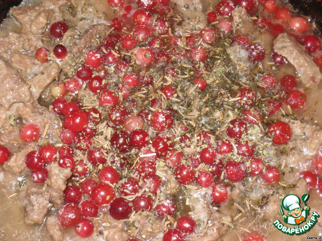 Нежное и сочное мясо в кисловатом соусе. Приготовление этого блюда не требует много времени, но благодаря бруснике вкупе с приправами, мясо становится очень вкусным.