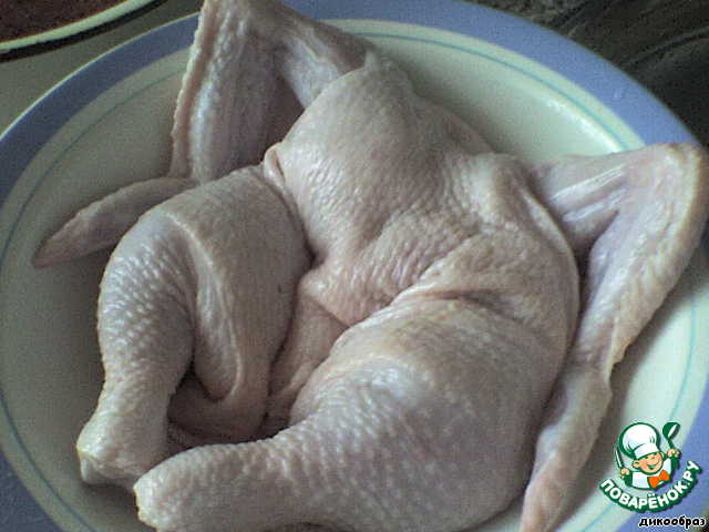 Обмазываем курицу специями и майонезом (я смешала его еще и с кетчупом).