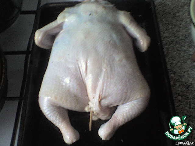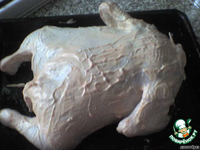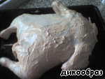 И отправляем в духовку на 45 минут, время зависит от размера курицы. Температура - 230 градусов. И получается такая красота.