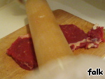 Второй секрет успеха - мясо должно быть как можно тоньше. Отбивая молотком, мы нарушим структуру, поэтому пройдемся скалкой сначала поперек, а потом вдоль куска.