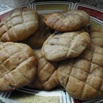 Тесто отдохнуло, можно делать коржики. Формировать их можно несколькими способами: раскатать тесто в колбаску, нарезать на нужное количество кусочков, сформировать из каждого кусочка шарик и аккуратно расплющить его в лепешечку толщиной 0,5 см - так сказать, будничный вариант. Можно раскатать все тесто в пласт толщиной 0,5 см и вырезать из него коржики или формочкой, или фигурным ножом, или стаканом (как я). Так или иначе подготовленные коржики укладываем на застеленный бумагой для выпечки противень. Делаем на коржиках насечки (чтобы все "по-настоящему") - тупой стороной ножа, линейкой или ребром кухонной лопатки (так удобнее полосатить небольшие коржики, как у меня, например). Отправляем коржики выпекаться в предварительно разогретую до 200-220 градусов духовку.