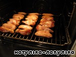 Выкладываем крылышки на решетку духовки. На нижний уровень ставим поддон, чтобы стекающий жир и маринад не запачкали духовку. Отправляем в предварительно разогретую до 200 град. духовку на 30 мин. Пару раз за это время можно достать крылышки и смазать их кисточкой оставшимся маринадом, чтоб они не пересыхали.