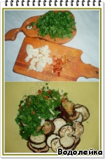 • Готовим заправку: чеснок почистить, у перца удалить серединку (т. е. семена). Мелко режем чеснок, перчик и зелень. И все это добавляем к готовым баклажанам.