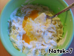 Готовим заливку: Яйца взбить со сметаной и соединить с натертым сыром, хорошо перемешать. Посолить и добавить специи по вкусу (в зависимости от того, какой сыр вы возьмете).
