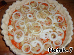 Сверху уложить жареный лук, следующий слой - нарезанный кольцами лук.
