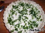 Покрыть сверху подготовленной заливкой и посыпать зеленью. Выпекать в предварительно нагретой духовке при температуре 200 градусов 30 минут, пока не подрумянятся бортики пирога и верх.