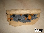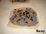 Выложить 1/4 часть маковой начинки и разровнять, выложить сухофрукты.