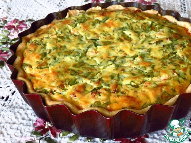 Готовый пирог вынуть и дать постоять 10 минут. Затем извлечь из формы, положить на решетку и посыпать зеленью.