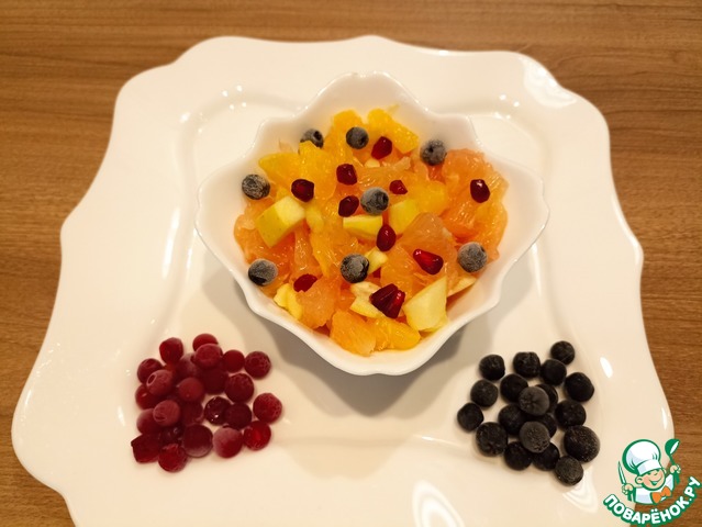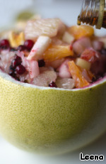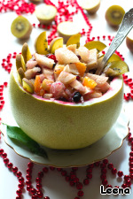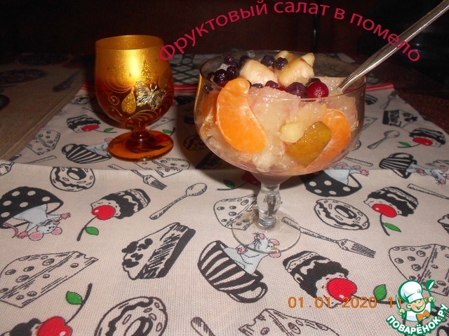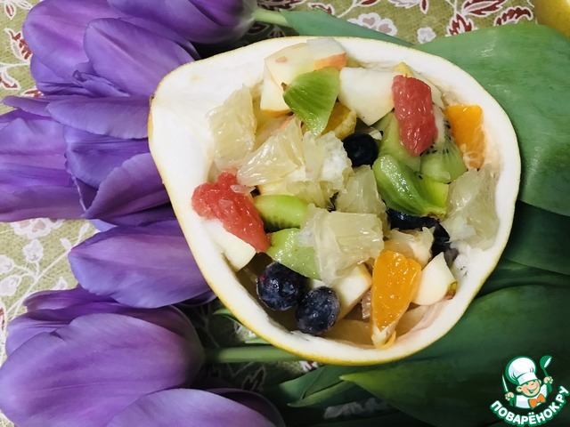 Помело на латыни звучит как Citrus maxima. То есть этого огромного цитруса хватит на большую компанию. А если из него сделать салатник, то в него поместится не менее 4 -х порций вкусного яркого фруктового салата! А ведь это то, что нужно для новогоднего десерта! А еще это мой сотый рецепт :-) Сама не верю!