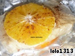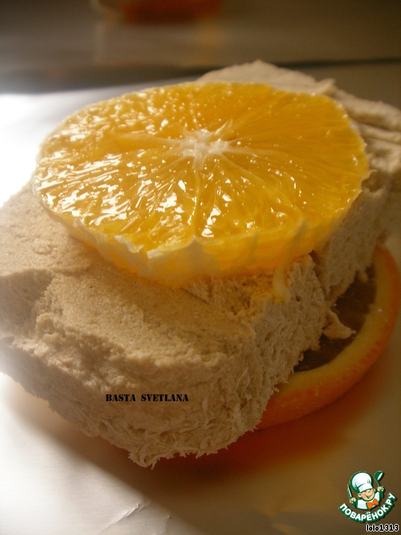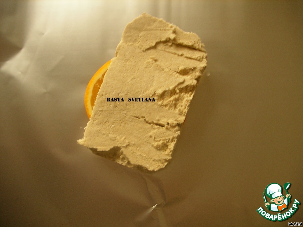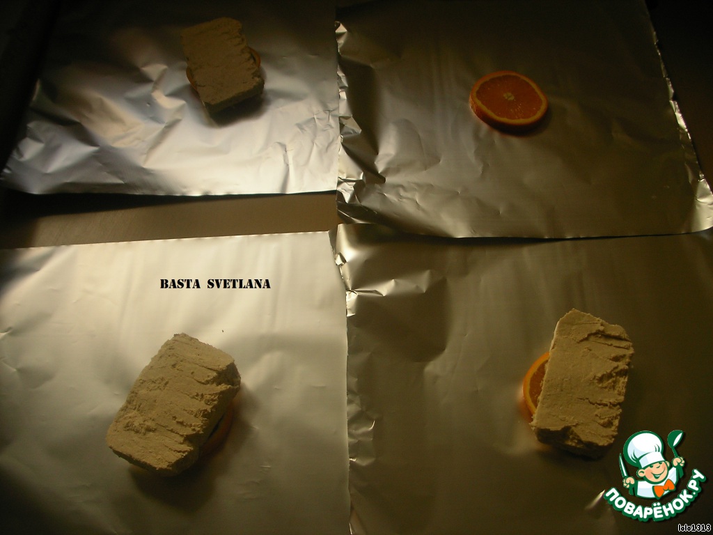 На небольшой лист фольги положить одну дольку апельсина с кожурой (это придаст дополнительный аромат десерту), затем небольшой кусок халвы и в завершение ещё одну дольку очищенного апельсина.