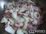 Добавляем лук, обжариваем несколько минут на сильном огне, постоянно помешивая.