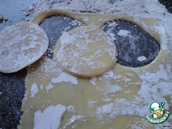 Из теста и марципана вырезать ими кружочки. Разрезать тесто горизонтально.
