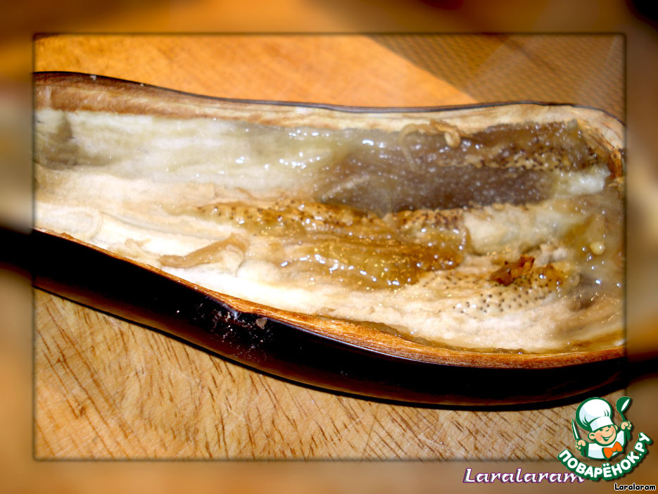 Разрезать вдоль на две равные половинки. Смазать солью и перцем - без фанатизму! - и запечь, процесс длился 30 мин. при температуре 190°... Одним словом, баклажаны должны иметь мягкую мякоть, но не всмятку!