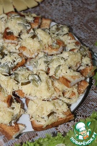 Салат: тёртый сыр соединить с солёными огурцами, нарезанными соломкой. -